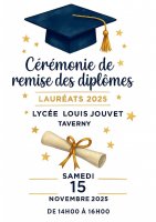 Cérémonie de remise des diplômes Lauréats 2025 /B_nb_commentaires> La cérémonie de remise des diplômes pour les lauréats des sessions 2025 aura lieu le samedi 15 novembre 2025 de 14h à 16h au lycée Louis Jouvet. Si vous ne pouvez pas être présent, vous pouvez remplir la procuration ci-dessous pour qu’une personne de votre choix récupère votre diplôme. Procuration